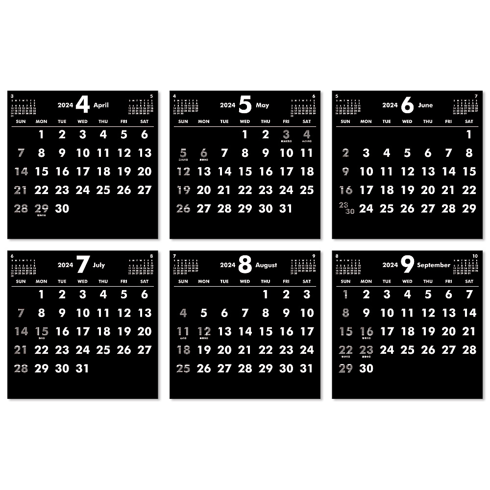 黒と白だけで表現されたスタイリッシュな4月始まり卓上カレンダーです。